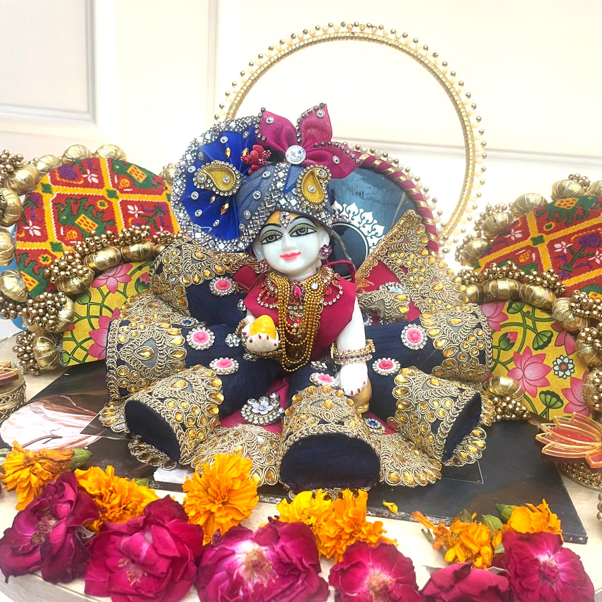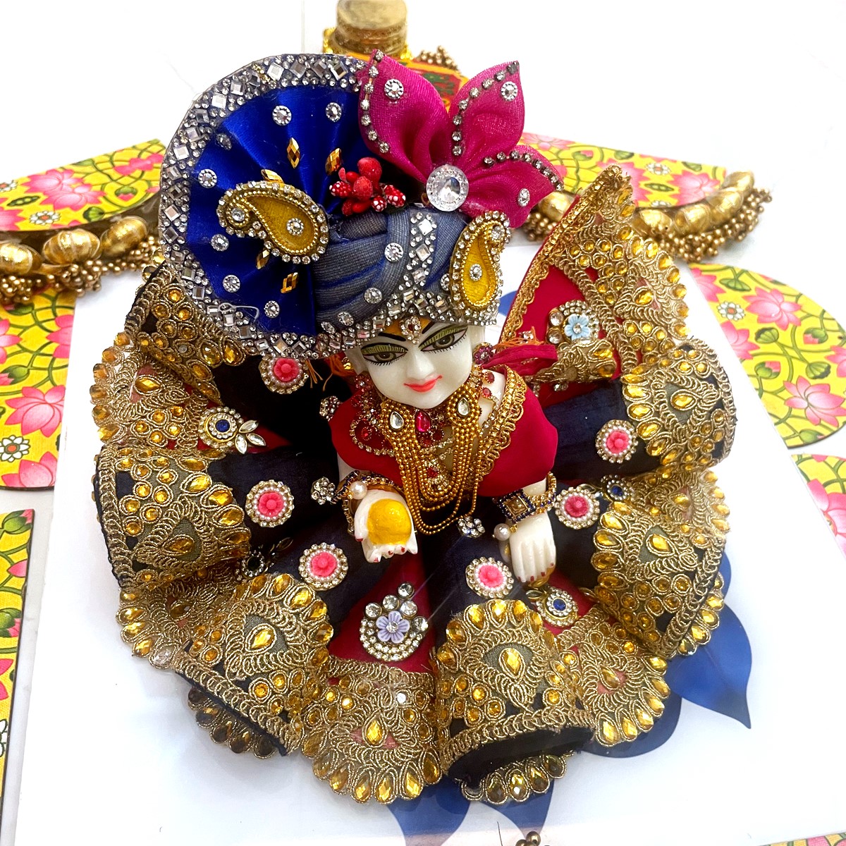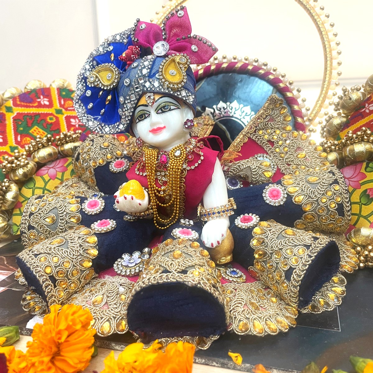 Dress up your Laddu Gopal in divine elegance. Inspired by the deep colors of the night and the powerful aura of Shyama Kali, this dress features a rich blue base beautifully decorated with golden embroidery, shiny stones, and delicate floral accents in pink. The look is royal yet devotional. Let your Bal Gopal shine like a gem under the night sky in this graceful shringar vastra.