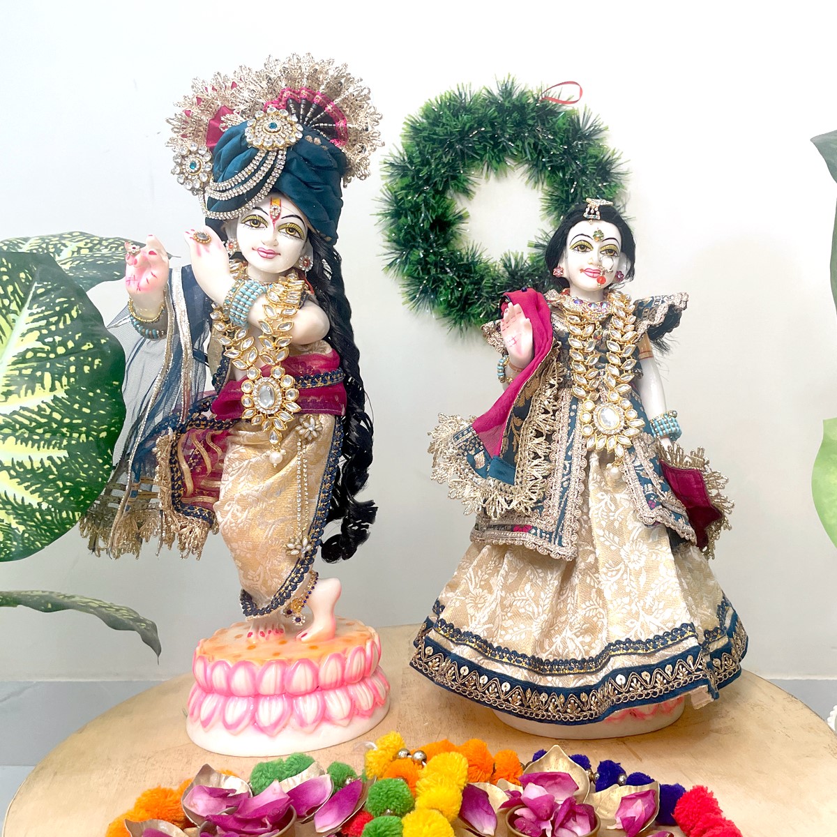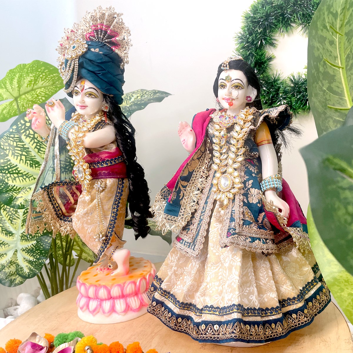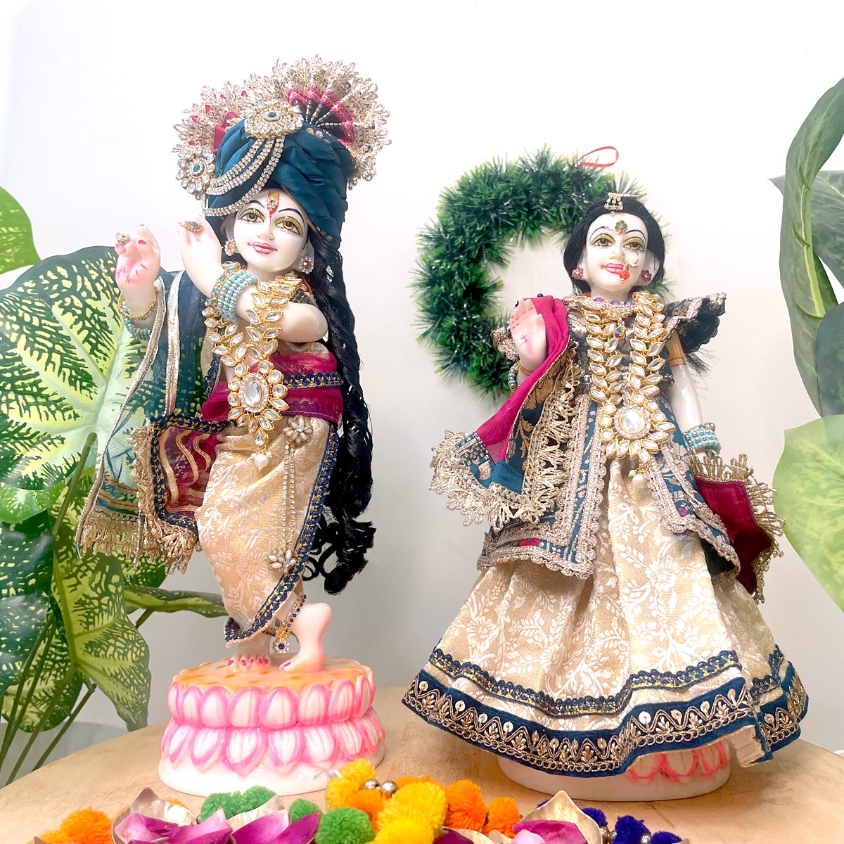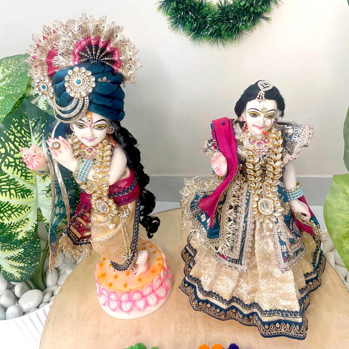 This graceful outfit is crafted in a soothing cream base, highlighted with elegant blue accents and a touch of festive pink. The attire for Radha Ji features a beautifully flared cream lehenga with blue lace border, paired with a matching kurti and a contrasting pink dupatta. Krishna Ji’s ensemble includes a cream dhoti-style bottom, complemented by a pink gamchha at the waist and a blue angavastram, adding royal charm to the look.