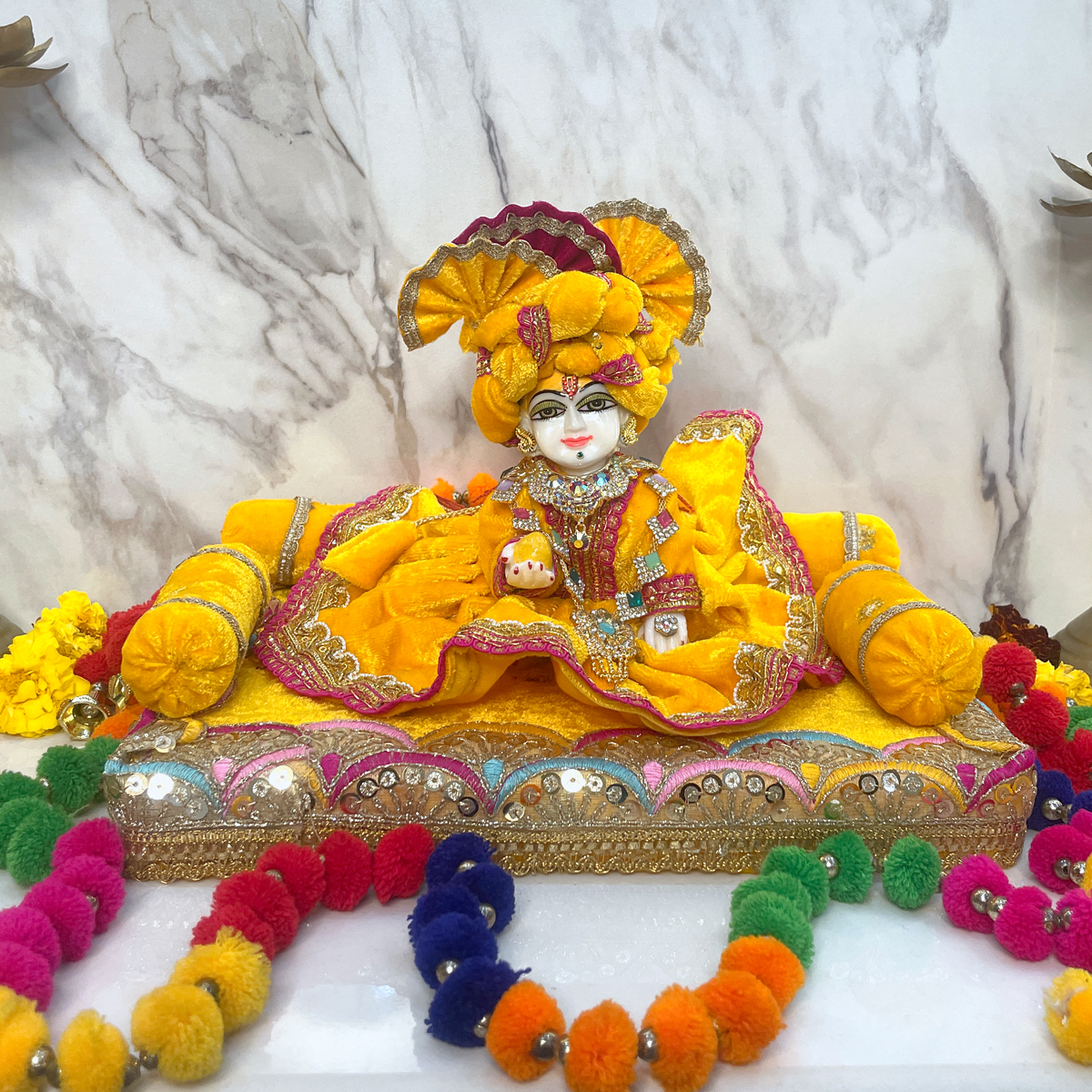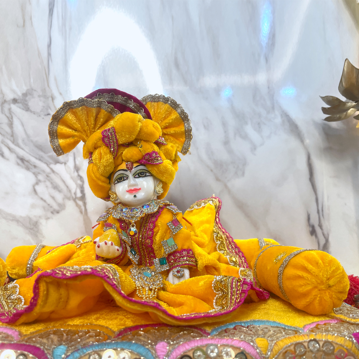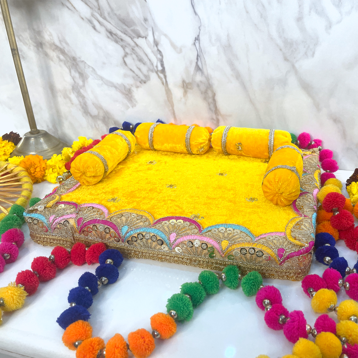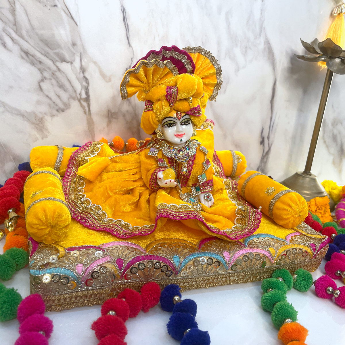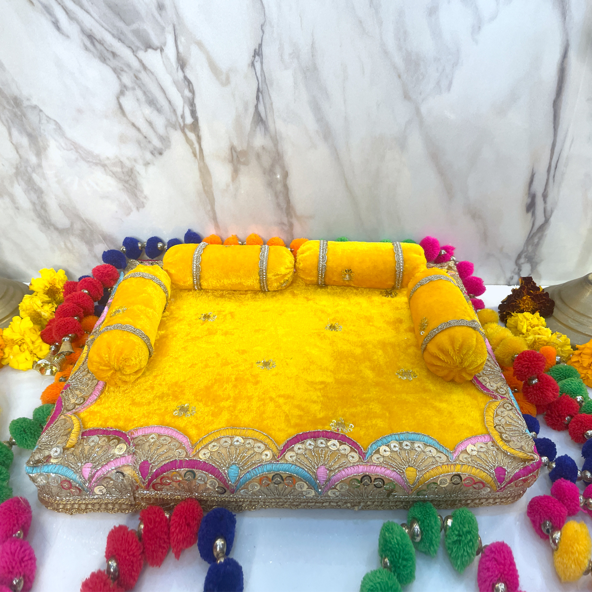 This luxurious yellow velvet singhasan features intricate golden lace work, sequence detailing, soft bolsters, and vibrant hand-embellished borders—creating a beautiful royal throne for your beloved Kanha.