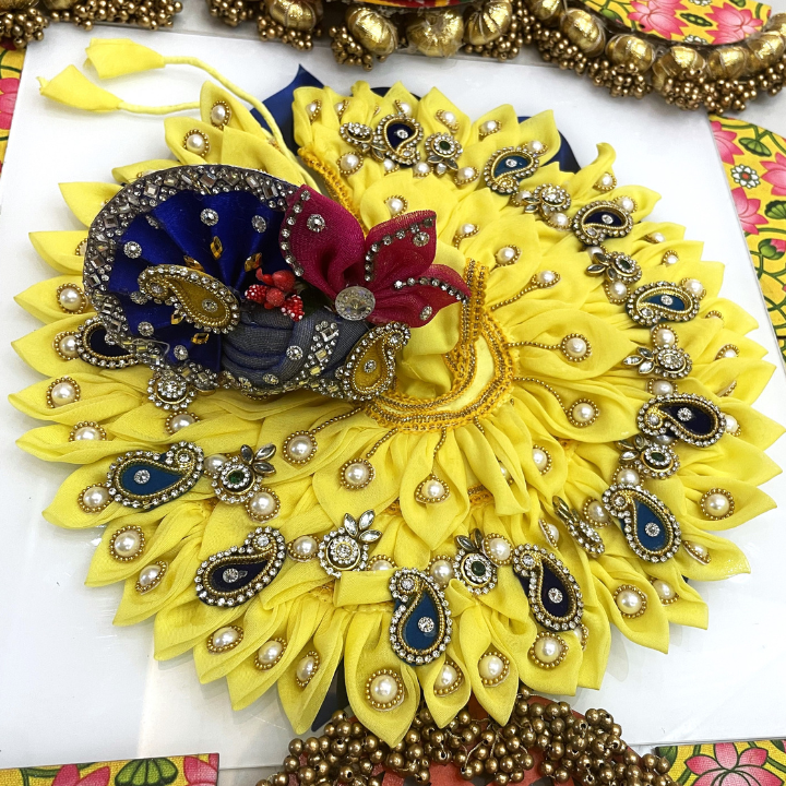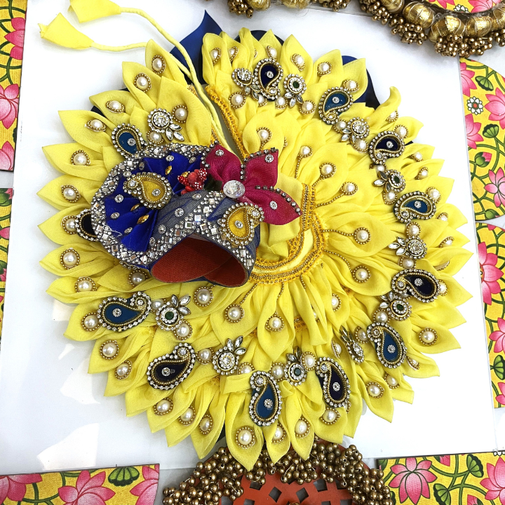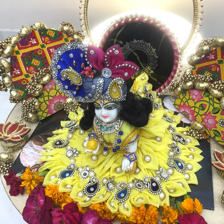 Radiating like the bloom of a Surajmukhi (sunflower), this bright yellow poshak brings a divine glow to your Laddu Gopal’s shringar. Accented with intricate blue and pearl embellishments, the dress beautifully balances tradition with festive charm. Designed for special darshan moments, its rich fabric and sparkling work make your Bal Gopal look truly divine.