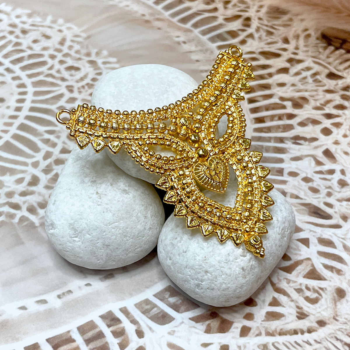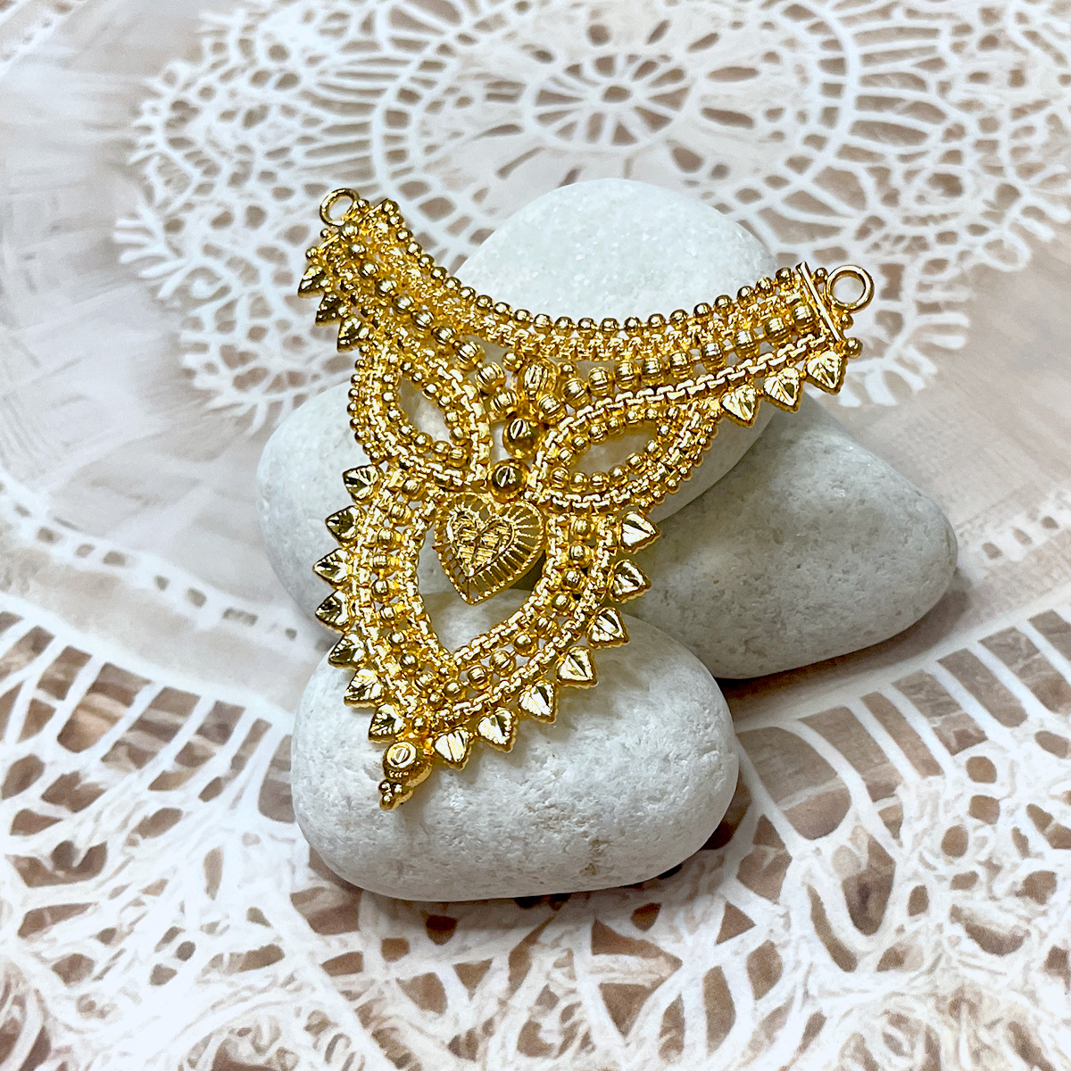 Adorn your revered deities with the timeless splendor of our ‘Swarna Kanthi,’ a magnificent golden choker necklace crafted with exquisite detail. This piece showcases intricate filigree work and delicate bead patterns, reminiscent of ancient temple jewellery. Its rich, golden hue and traditional design evoke a sense of heritage and divine grandeur, perfect for enhancing the majestic presence of your idols. This ‘kanthi’ (choker) style necklace offers a regal and profound adornment, ideal for daily worship or special festive occasions. Suitable for idols typically ranging from 15 to 18 inches.