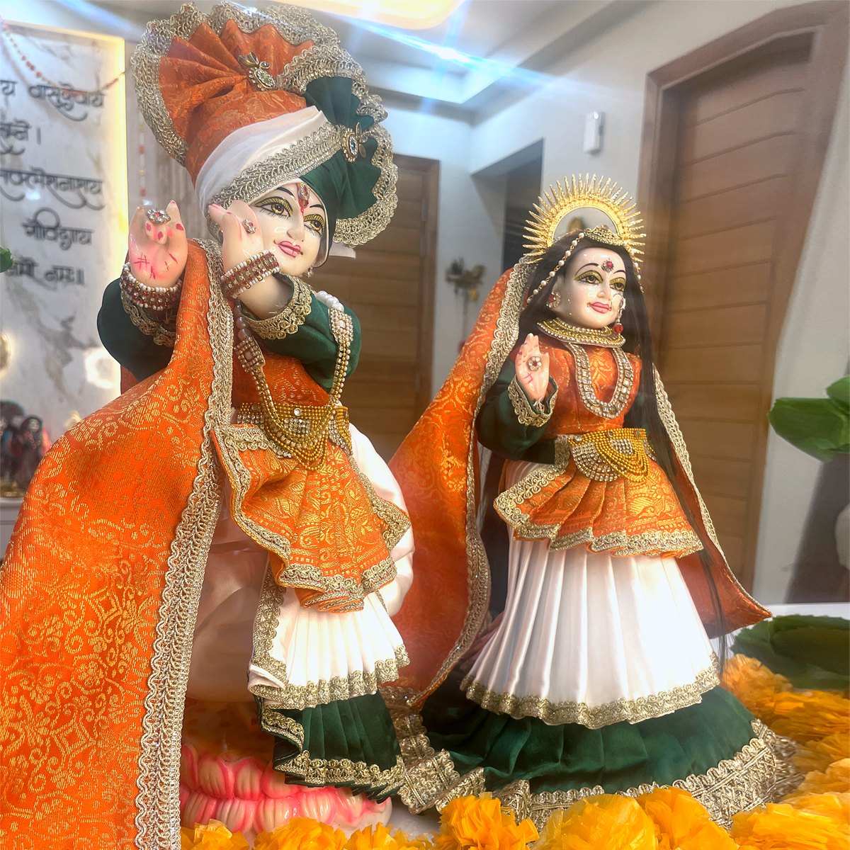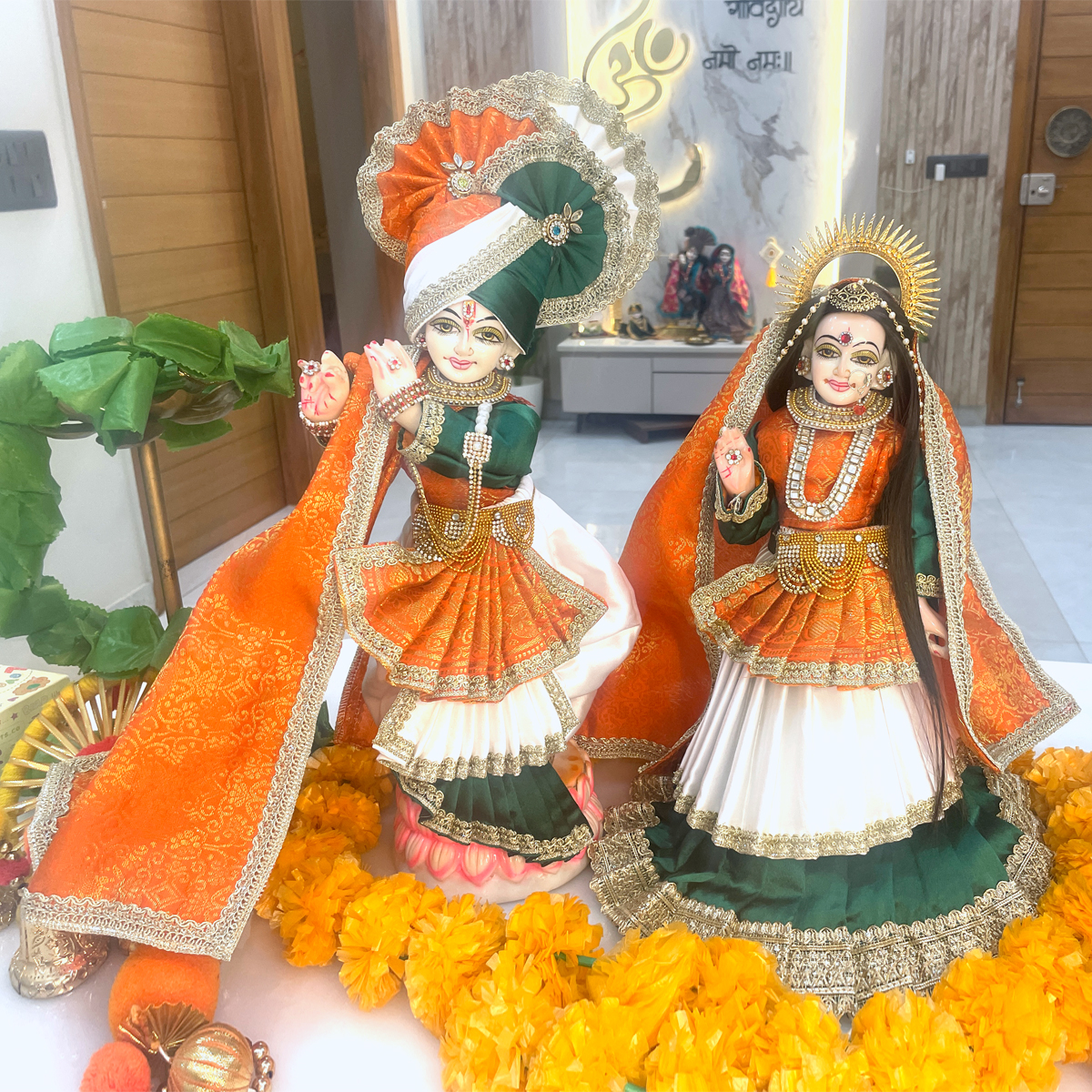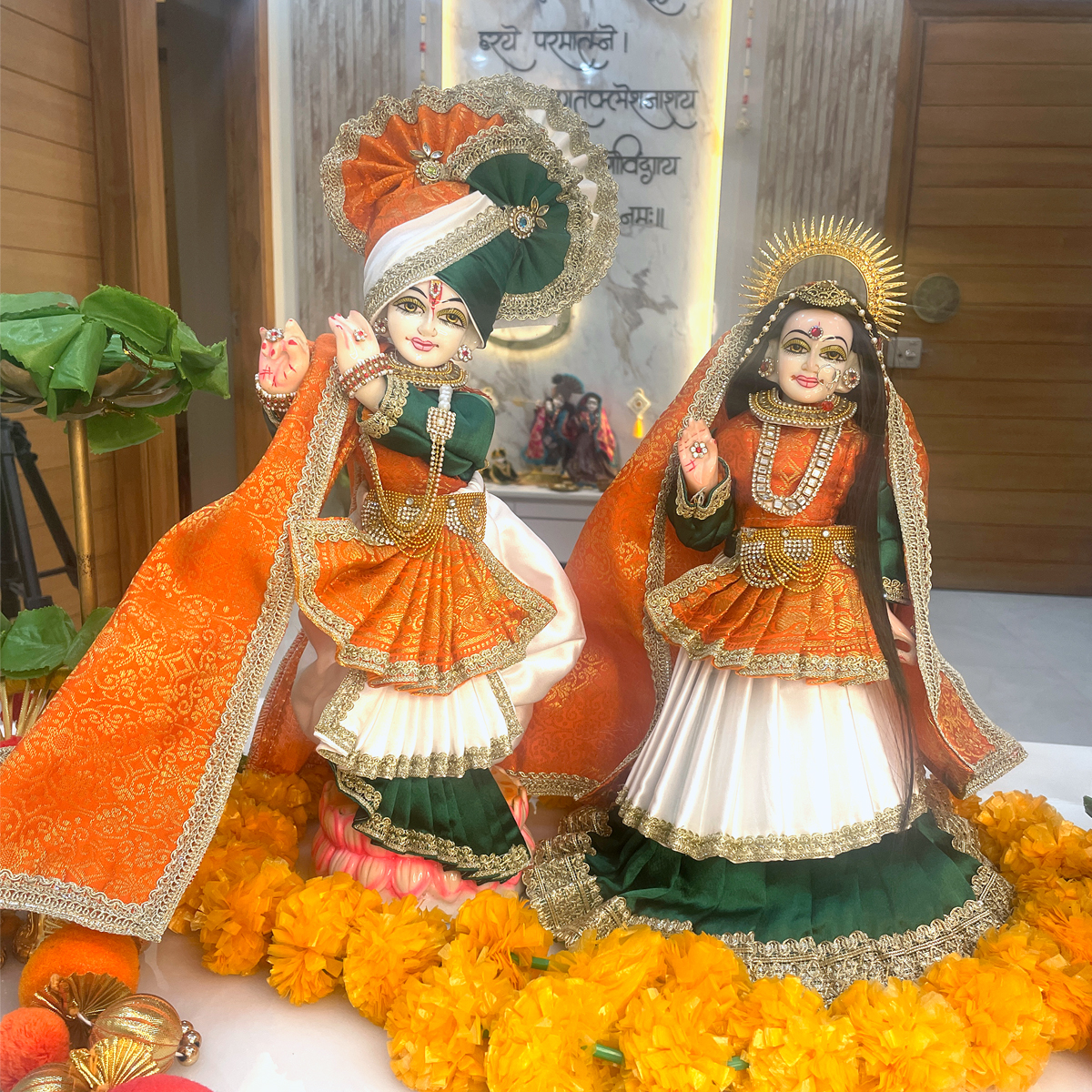 Inspired by the spirit of Vande Mataram, this Republic Day special Tricolor Shringar Poshak beautifully reflects the soul of India through devotion. As Radha-Krishna are adorned in the sacred national colors, the poshak symbolizes dharma, unity, and eternal love for both the nation and the Divine. A perfect shringar for Republic Day puja and special darshan.