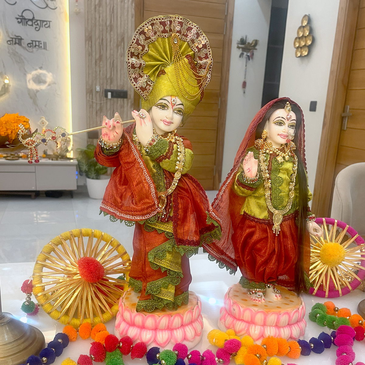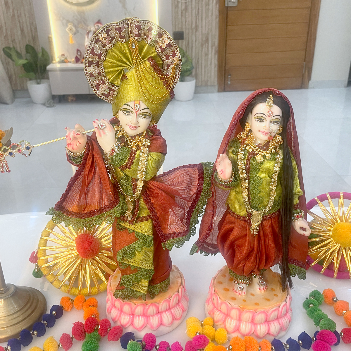 Bring home the earthy elegance of Vrindavan with this green and rust (mehndi–gerua) Radha Krishna poshak, inspired by natural devotion and festive leela bhav. The soothing green symbolizes growth, harmony, and divine compassion, while the warm rust tone reflects celebration, bhakti, and sacred tradition.