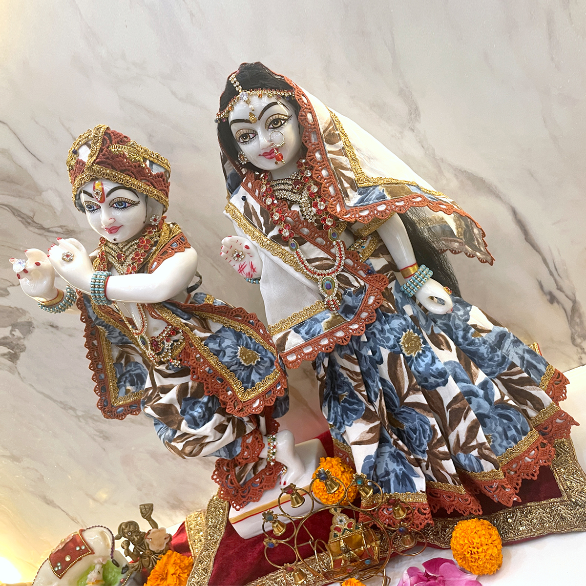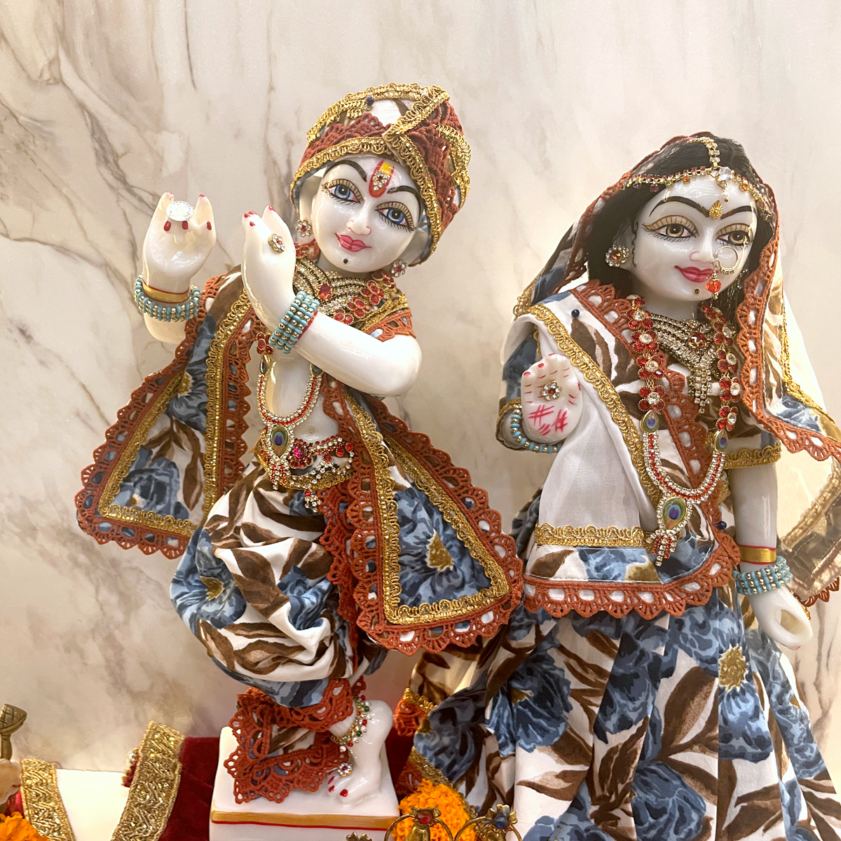 Radha Rani’s dress includes a white lehenga, blouse, and dupatta – graced with delicate blue flowers and brown leaves, finished with subtle brown lace.