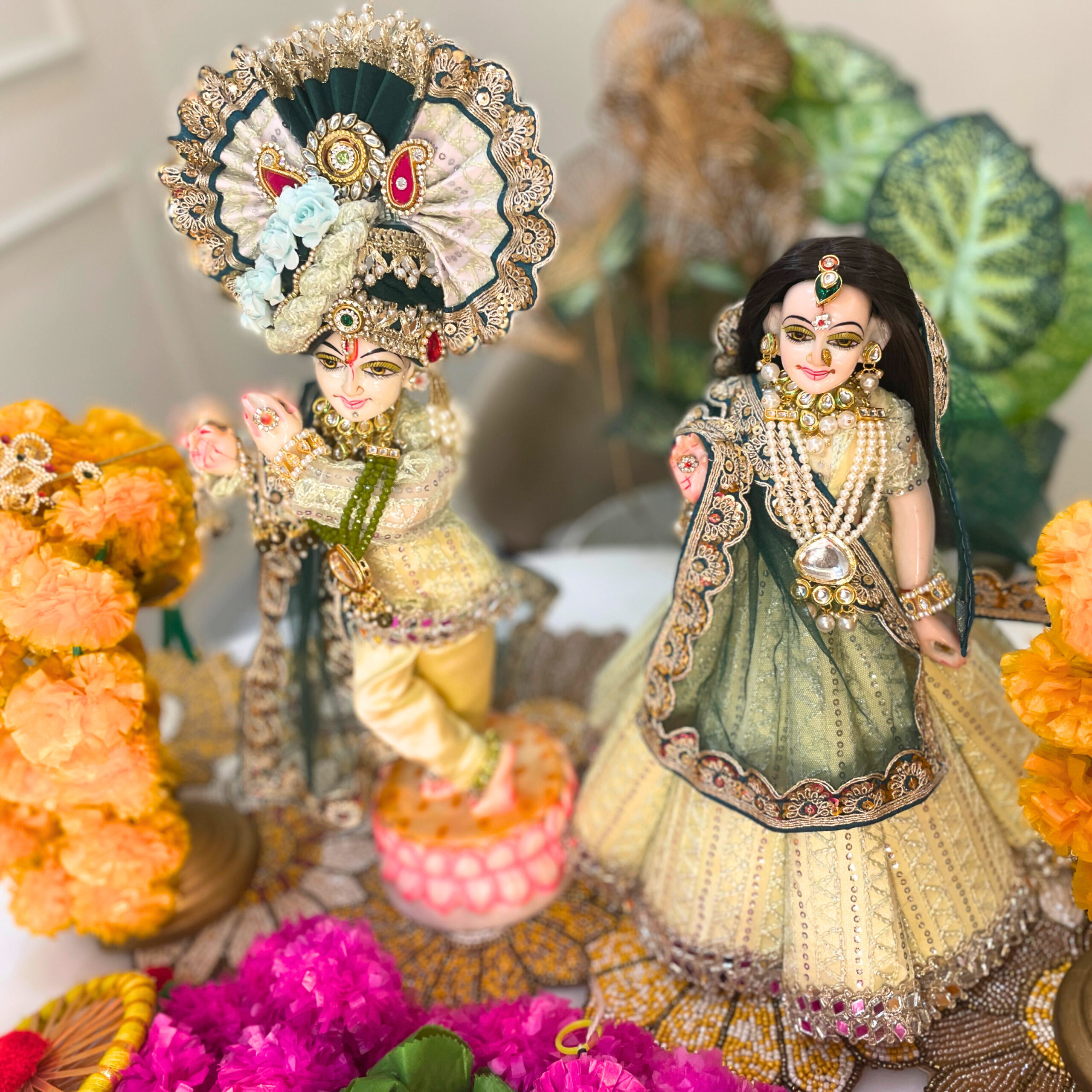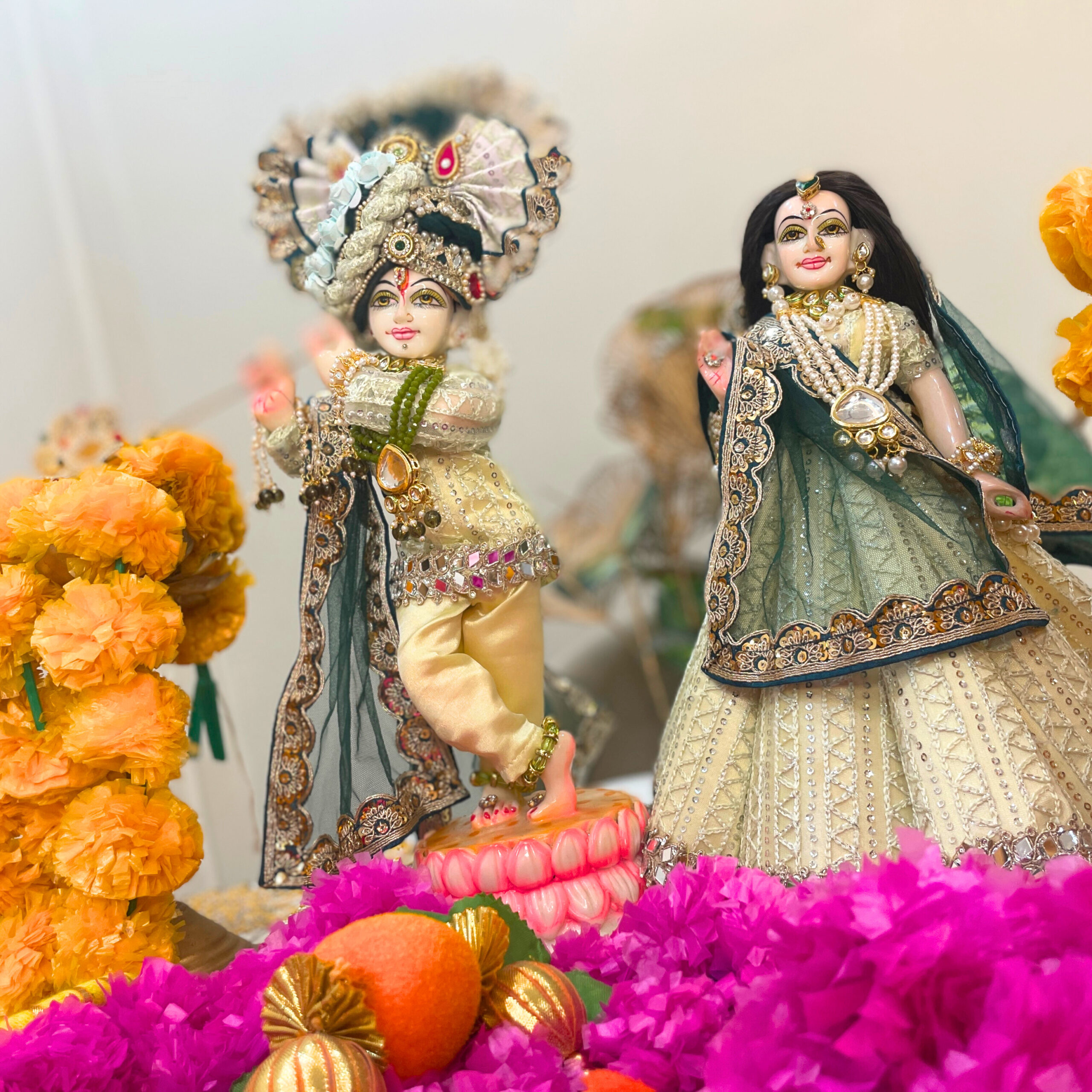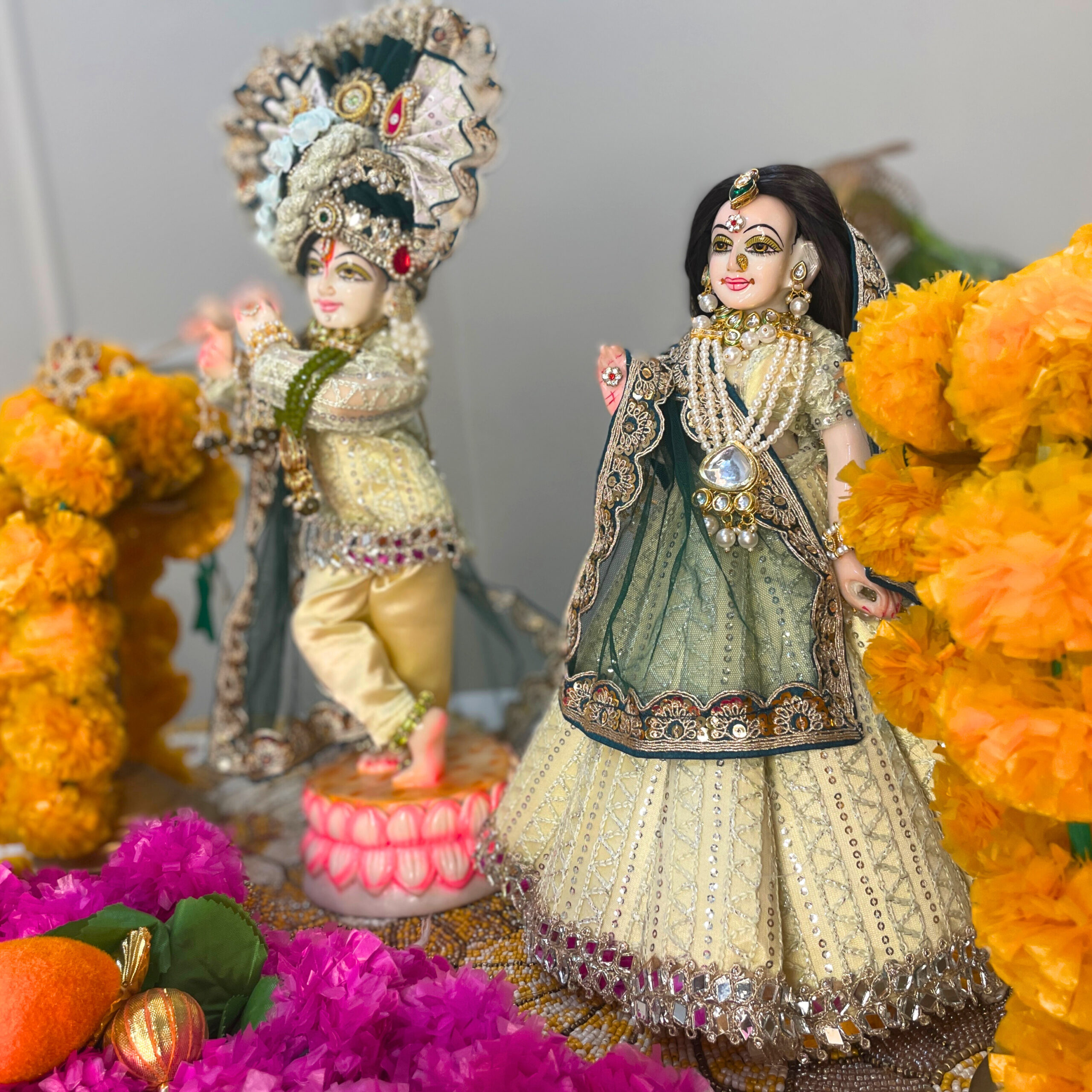 Gracefully adorned in elegant green and golden attire, this divine Radha-Krishna Shringar reflects the eternal beauty of Vrindavan. The soothing colors symbolize love, harmony, and devotion. May this sacred darshan fill every heart with peace and the sweet blessings of Radha-Krishna.