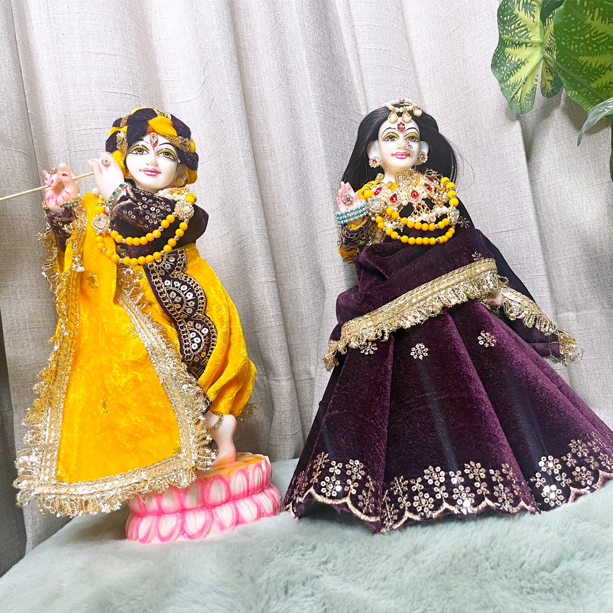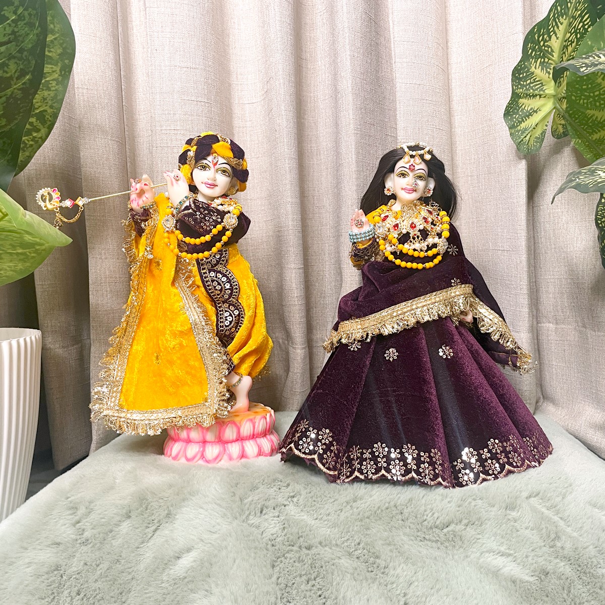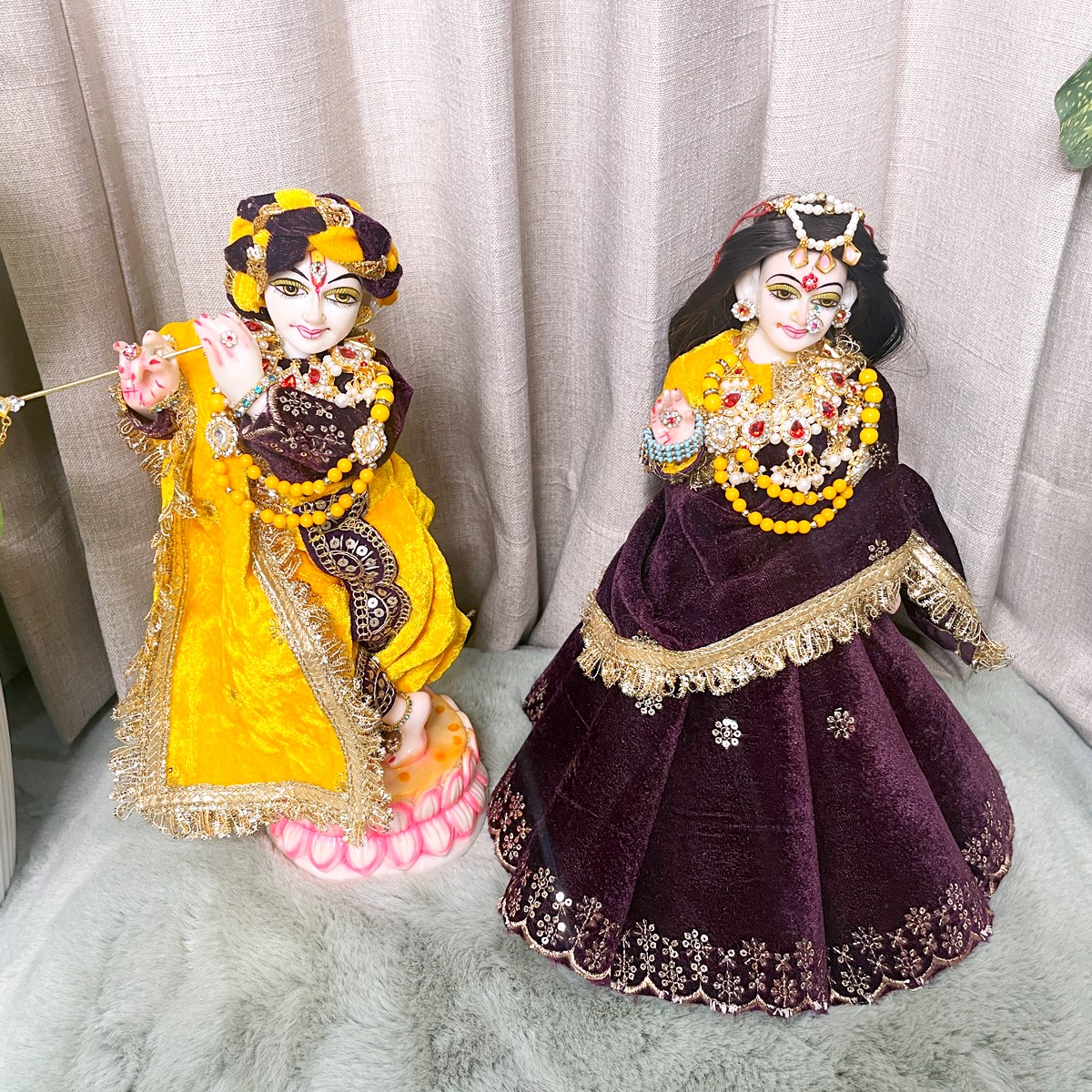 This winter set is crafted in soft velvet to give Radha and Krishna a warm and divine appearance. Radha Ji’s attire features a rich purple lehenga paired with a bright yellow full-sleeve blouse and a matching purple dupatta that brings a graceful festive charm. Krishna Ji’s outfit comes with a yellow dhoti, a deep purple kurta, and a coordinated yellow angvastram that completes the traditional look.