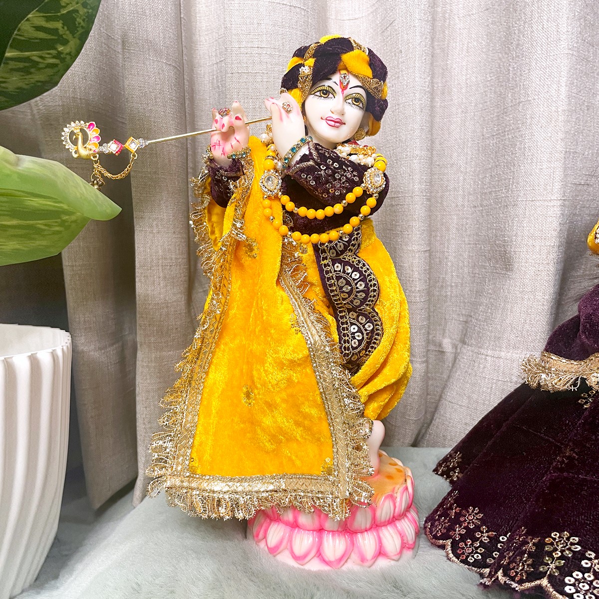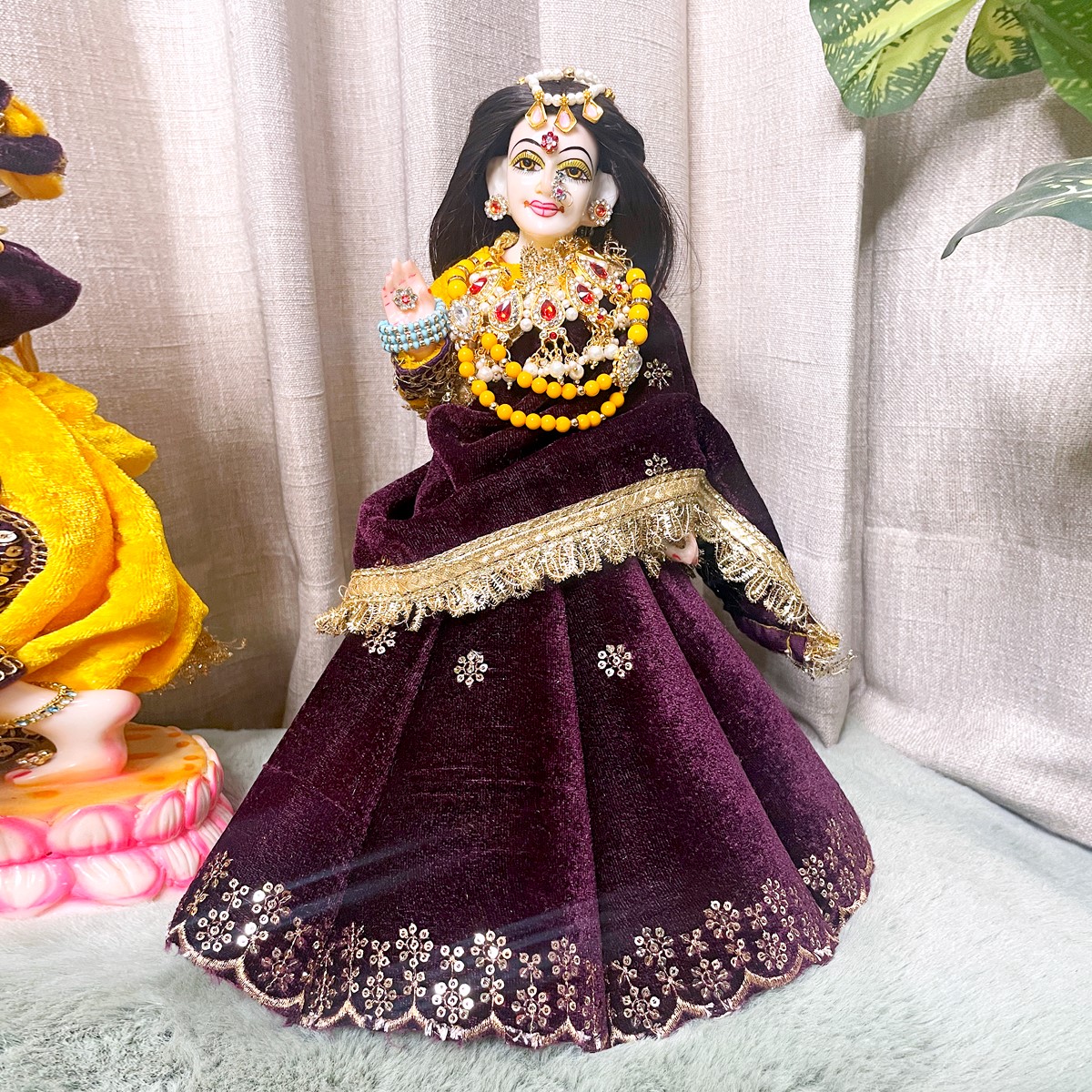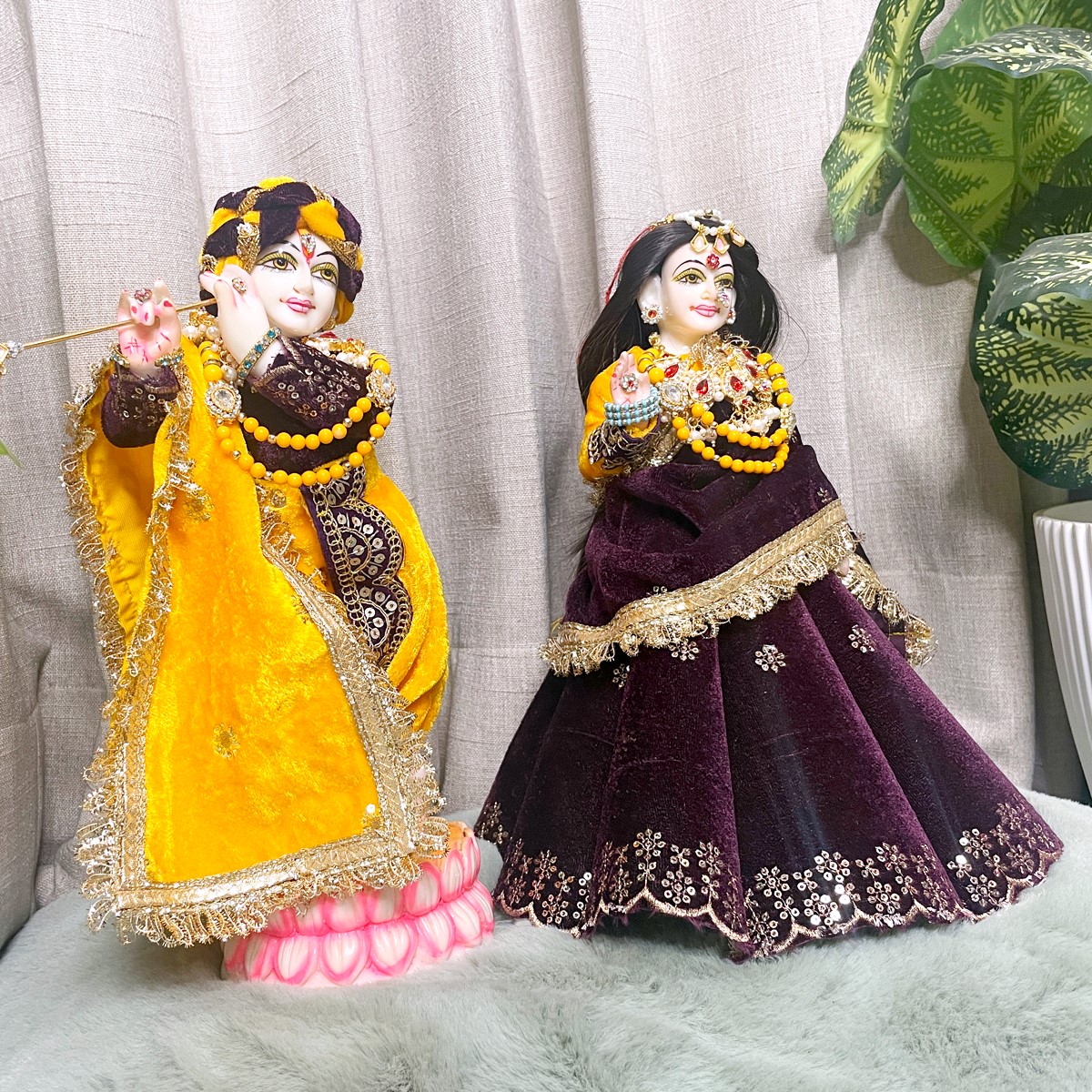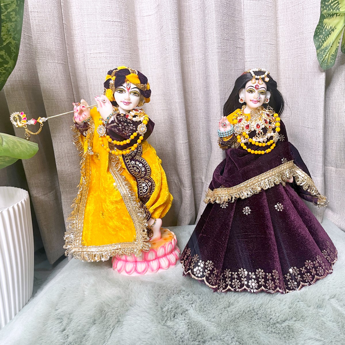 This winter set is crafted in soft velvet to give Radha and Krishna a warm and divine appearance. Radha Ji’s attire features a rich purple lehenga paired with a bright yellow full-sleeve blouse and a matching purple dupatta that brings a graceful festive charm. Krishna Ji’s outfit comes with a yellow dhoti, a deep purple kurta, and a coordinated yellow angvastram that completes the traditional look.